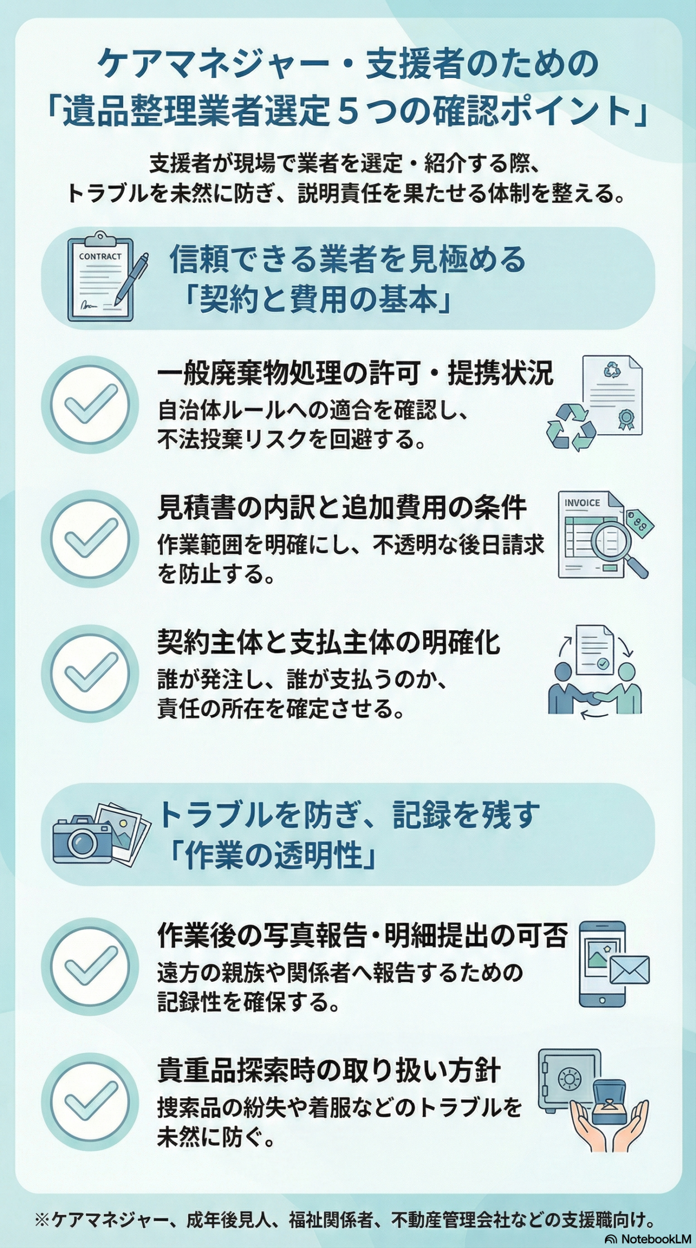 ケアマネジャー・ソーシャルワーカー・成年後見人などの支援者が、現場で業者を比較・検討する際や、ご家族へ説明する際の確認シート(エビデンス資料)としてご活用いただけます。